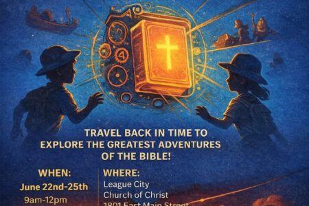 ️✨ Step Into God’s Story — Become Bible Time Travelers! ✨️League City Church of Christ invites kids to Vacation Bible School 2026: Bible TimeTravelers — an exciting journey through the greatest adventures of the Bible! 📖 Theme Verse:“He has made everything beautiful in its time. Also, he has put eternity into man’s heart, yet sothat he cannot find out what God has done from the beginning to the end.”— Ecclesiastes 3:11 📅 June 22–25, 2026 ⏰ 9:00 AM – 12:00…